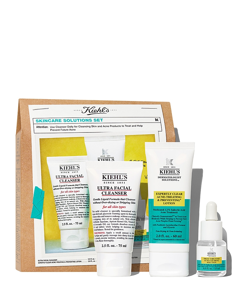What It Is:Cleanse, treat and control your skin with Kiehl’s Skincare Solutions Set. Target acne and blemishes while hydrating skin and preventing breakouts. This complete set for acne-prone skin gently cleanses, spot treats blemishes with 10% sulphur, prevents future breakouts and soothes skin with a moisturizing formula that includes 1.2% salicylic acid and 2% niacinamide, effectively helping to correct uneven texture and tone.Set Includes:- Ultra Facial Cleanser 2.5 oz.- Expertly Clear Acne-T