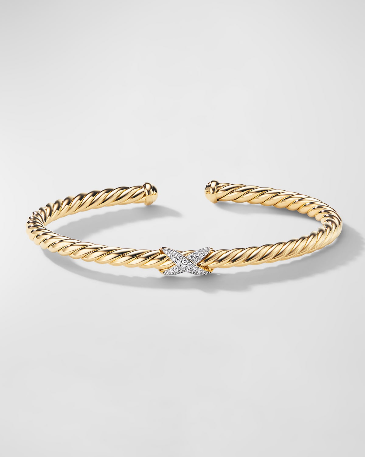 David Yurman bracelet from the Cable Collection. Polished 18-karat yellow gold cablespira hardware. X-shaped station with white diamond pav. 0.15 total diamond carat weight. Flexible design eases dress. Approx. 4mm wide. Imported.