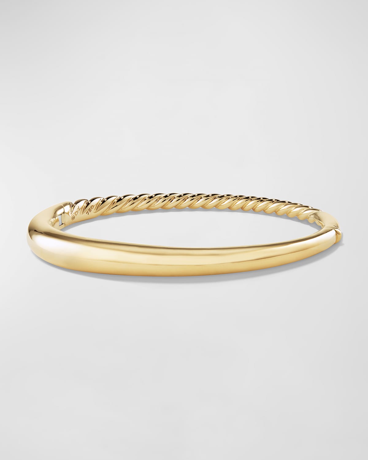 David Yurman bracelet from the Pure Form Collection. 18-karat yellow gold. Approx. 6.5mm width. Diameter, 57mm (2.3"). Hinged side eases dress. Imported.