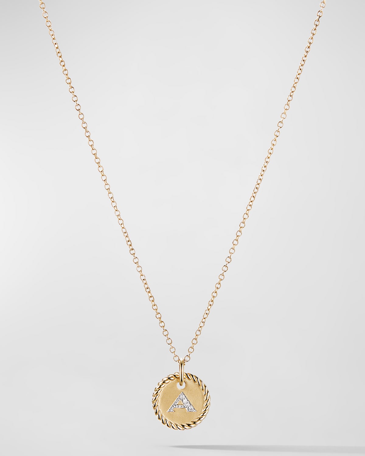 David Yurman necklace from the Cable Collectible Collection. 18-karat yellow gold. Round pendant with cable trim. Pav diamond "A" initial. 0.01 total diamond carat weight. Chain, 1.1mm Adjustable length, 16-18"L Pendant, 10mm.