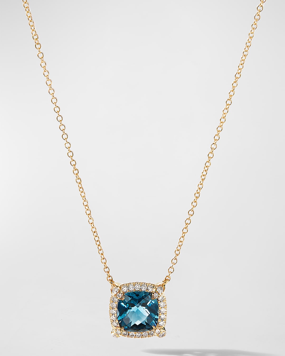 18-karat yellow gold Hampton blue topaz or champagne citrine Pavé diamonds; 0.12 total carat weight Approx. 7mm pendant Approx. 18" length Lobster clasp Wipe clean Made in USA