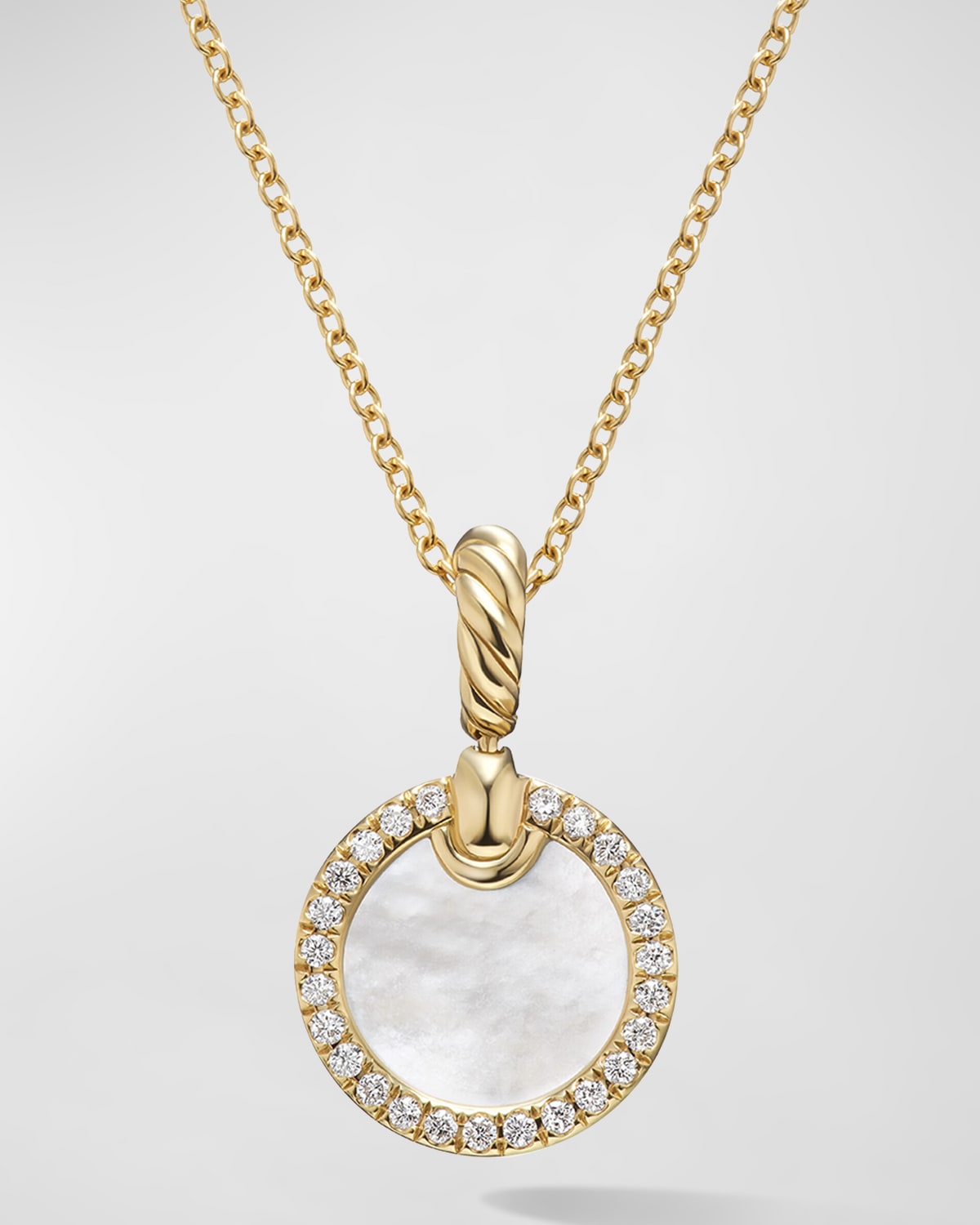 18-karat yellow gold Mother-of-pearl; pavé diamonds, 0.11 total carat weight Approx. 16-18" length; 17.8mm x 11.3mm pendant Adjustable length Lobster clasp Imported