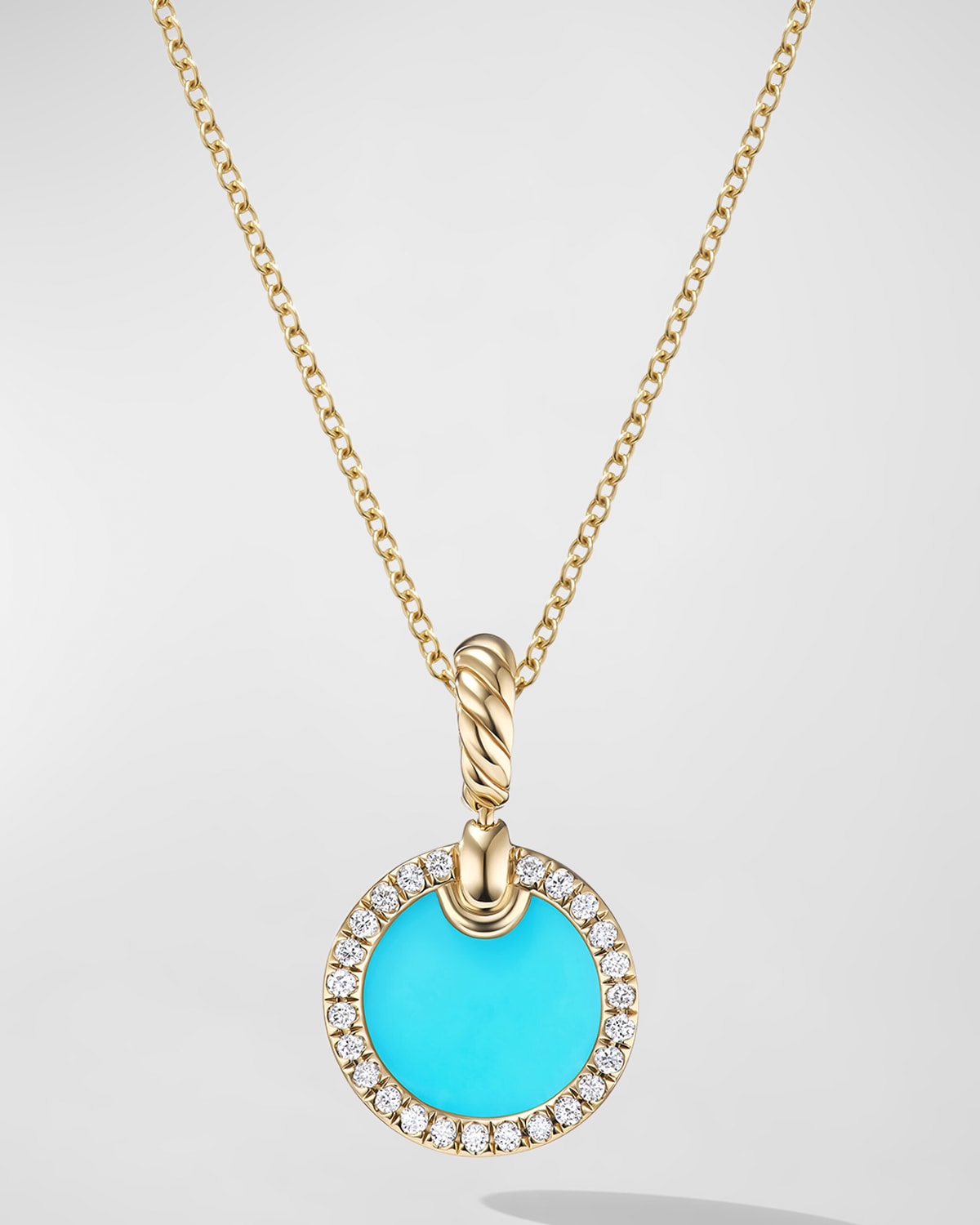 18-karat yellow gold Turquoise; pavé diamonds, 0.11 total carat weight Approx. 16-18" length; 17.8mm x 11.3mm pendant Adjustable length Lobster clasp Imported