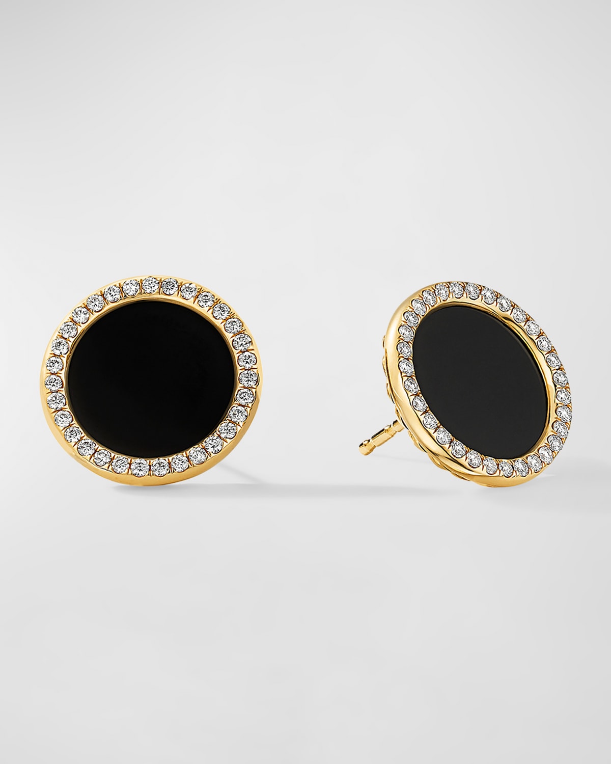 David Yurman stud earrings. Approx. 14mm 18-karat yellow gold. Round black onyx. Pave diamonds, 0.33 total carat weight. Post backs for pierced ears. Approx. 0.5"L (11.5mm). Imported.