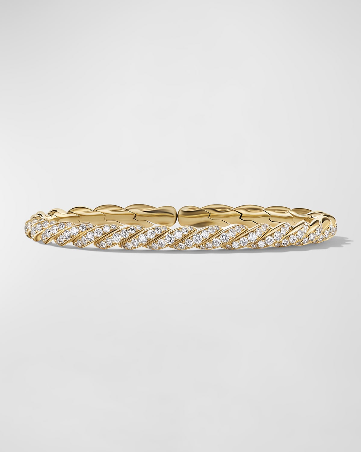 David Yurman bracelet from the Pavflex Collection. Polished 18-karat yellow gold band and settings. Cable motif with white diamond pave. 1.64 total diamond carat weight. Flexible design; slip-on style. Approx. 0.2"W (5mm). Imported.