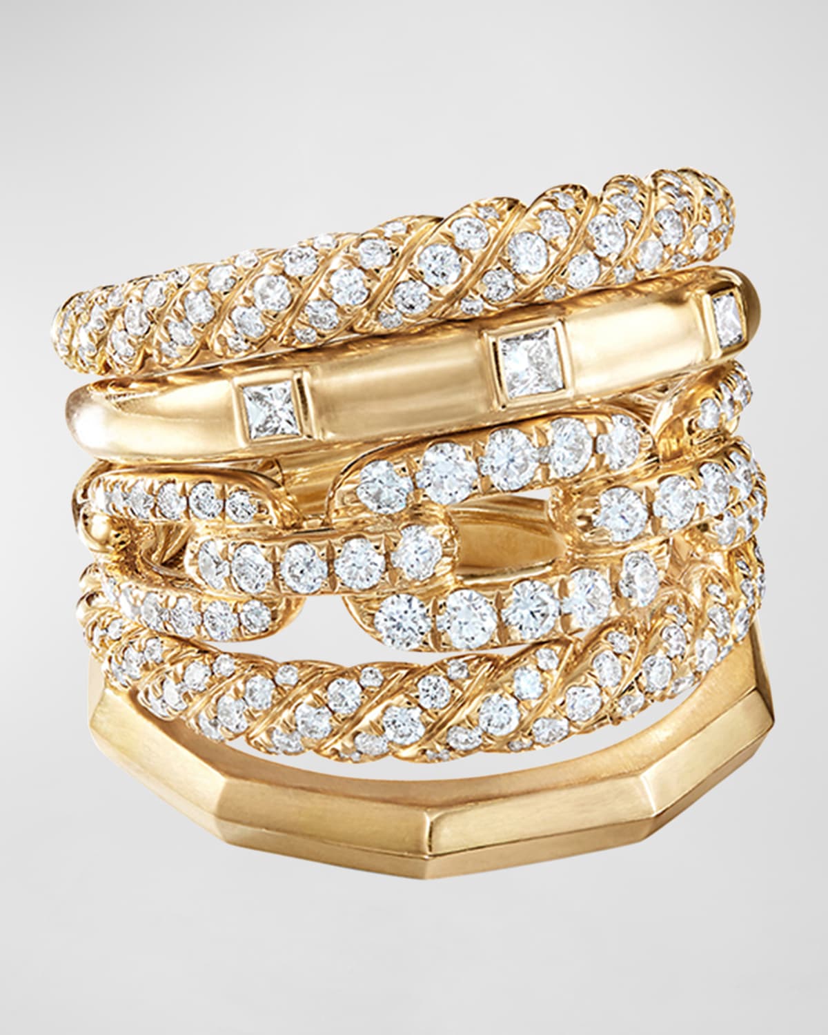 David Yurman ring from the Stax Collection. Polished 18-karat yellow gold as hardware. Stacked rows with white diamonds. 1.06 total diamond carat weight. Approx. 21mm. Imported.