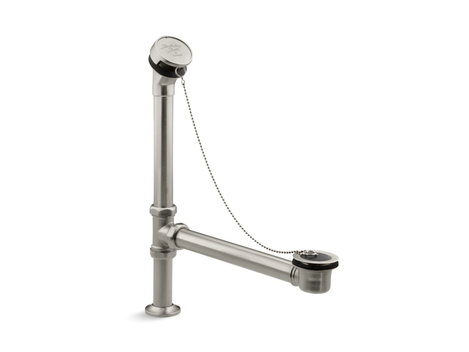 Complete the nostalgic charm of your freestanding Birthday Bath(R) with this KOHLER® Antique bath drain. This brass tee and pipe comes with a sturdy chain and rubber stopper, designed to unify your bathroom decor.