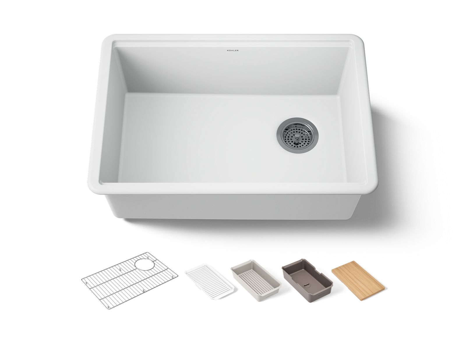 The KOHLER® Billings 27" undermount workstation kitchen sink raises the bar on functionality and professional styling with custom accessories that integrate seamlessly within the bowl’s ledge. With an eye toward food preparation as well as cleanup and storage, the included accessories are both thoughtful and practical. The Billings sink is made of KOHLER® Neoroc, a matte-finish composite material designed for extreme durability and unmatched beauty. Richly colored to complement any countertop, N