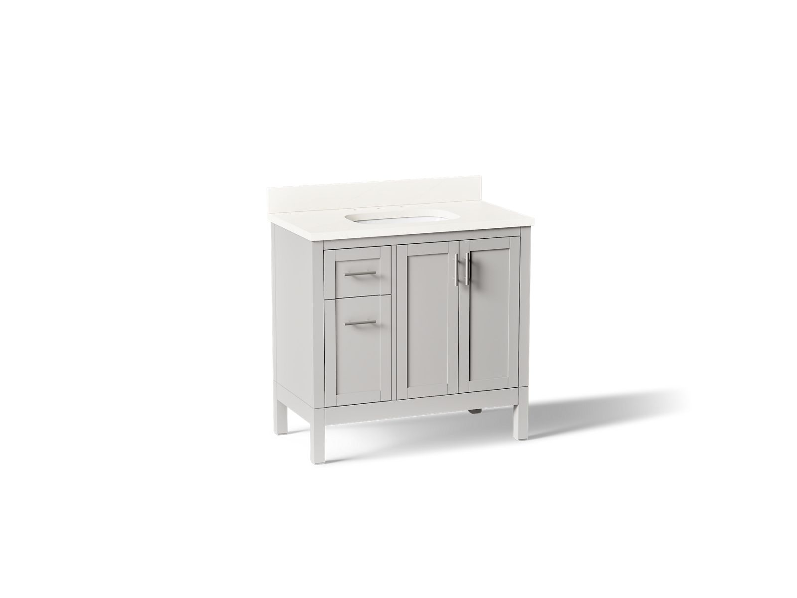 In typical Shaker style, the KOHLER® Hadron bathroom vanity set is a classic. This modest, clean design doesn’t overpower your bathroom – it blends into it – lending itself to many decorating styles. The Hadron 36" freestanding single sink vanity set includes cabinet, quartz countertop, sink, and Vibrant® Brushed Nickel hardware. Pair with any KOHLER® widespread bathroom sink faucet for your own unique touch.