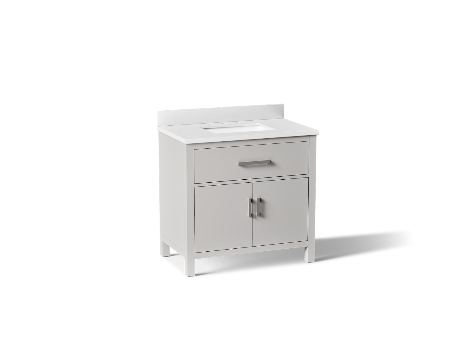 The KOHLER® Kresla vanity collection brings a quiet sophistication into your bathroom space with its with clean, architectural lines and range of finishes, and with its roomy interior, you’ll find ample storage space to keep your bathroom organized and clutter-free. The Kresla 36" freestanding single sink vanity set includes cabinet, quartz countertop with matching backsplash, sink, and hardware. With KOHLER®, it’s easy to find the design solution that’s right for you.