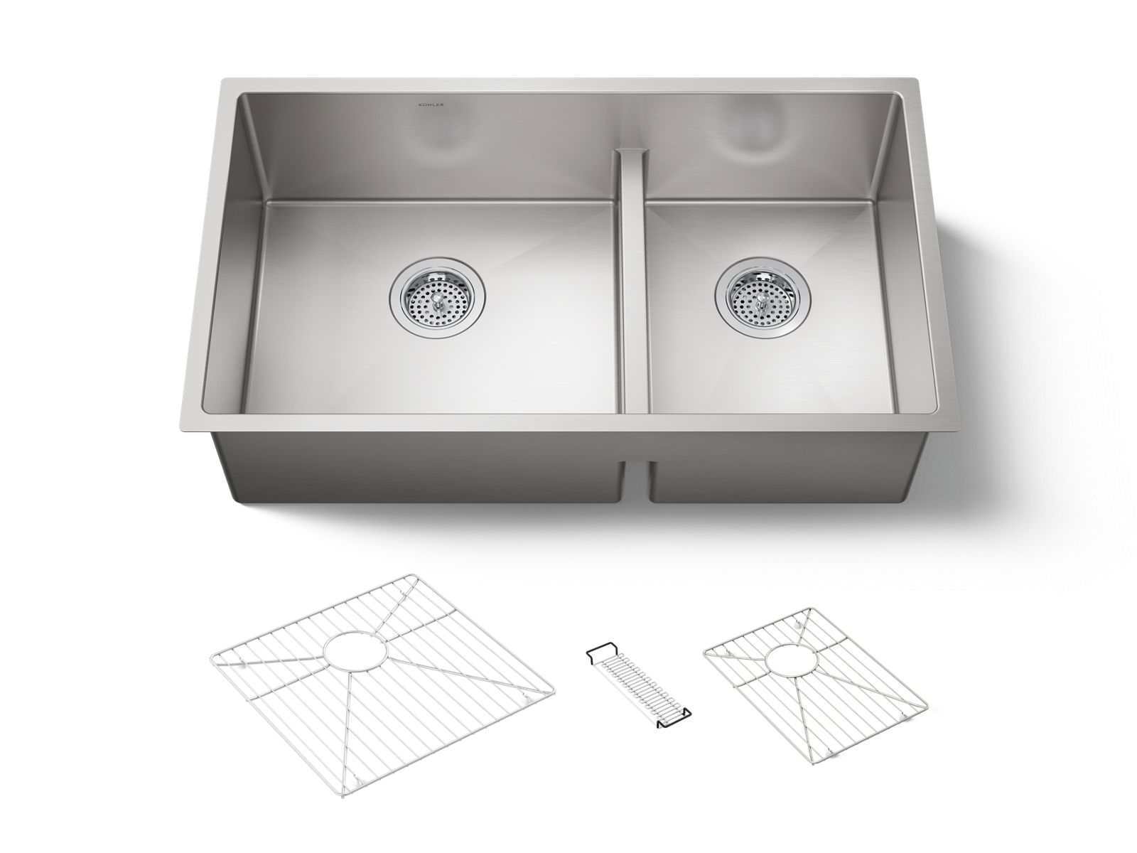 This KOHLER® Strive kitchen sink offers professional style with easy-to-clean curved corners. Made of thick, premium quality 16-gauge stainless steel, the large and medium offset bowls feature a sound-absorption system that significantly reduces disposal and dishwashing noise. A low barrier divides the two compartments, making it easy to wash and rinse large items while still keeping the basins separate. This undermount kitchen sink includes a bottom sink rack to help prevent scratches and a sin