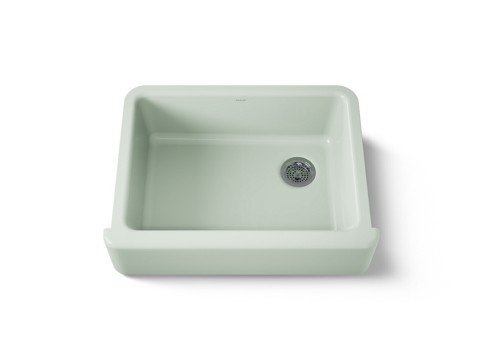The KOHLER® Whitehaven apron-front kitchen sink features a streamlined and versatile farmhouse style. The Self-Trimming design requires only a simple rough cut, overlapping the cabinet face for beautiful results. The tall integral apron also acts as a drip edge to protect the cabinet from water damage. A large single basin accommodates large pots and pans, while the sloped bottom helps with draining and cleanup. Crafted from enameled cast iron, this sink resists chipping, cracking, or burning fo